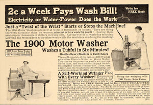 This is an original 1913 black and white print ad for the 1900 Motor Washer, an early washing machine run by either electric or water motor, from the 1900 Washer Co., 6058 Court St., Binghamton, N.Y.