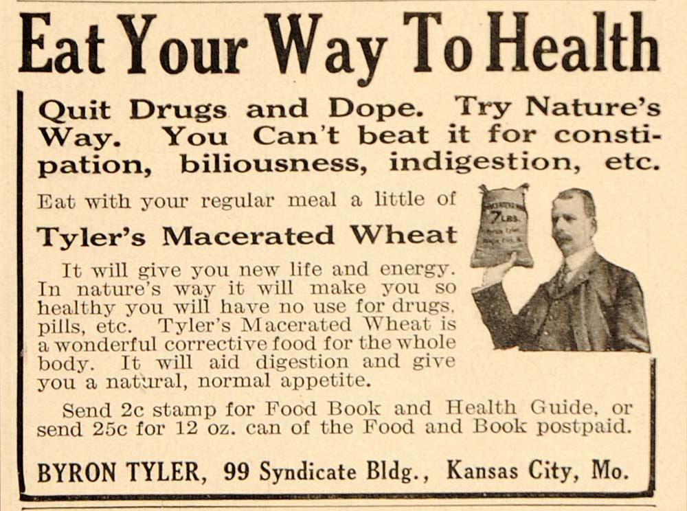 This is an original 1913 black and white print ad for Tyler's Macerated Wheat-- "Nature's Way" from Byron Tyler, 99 Syndicate Bldg., Kansas City, MO.