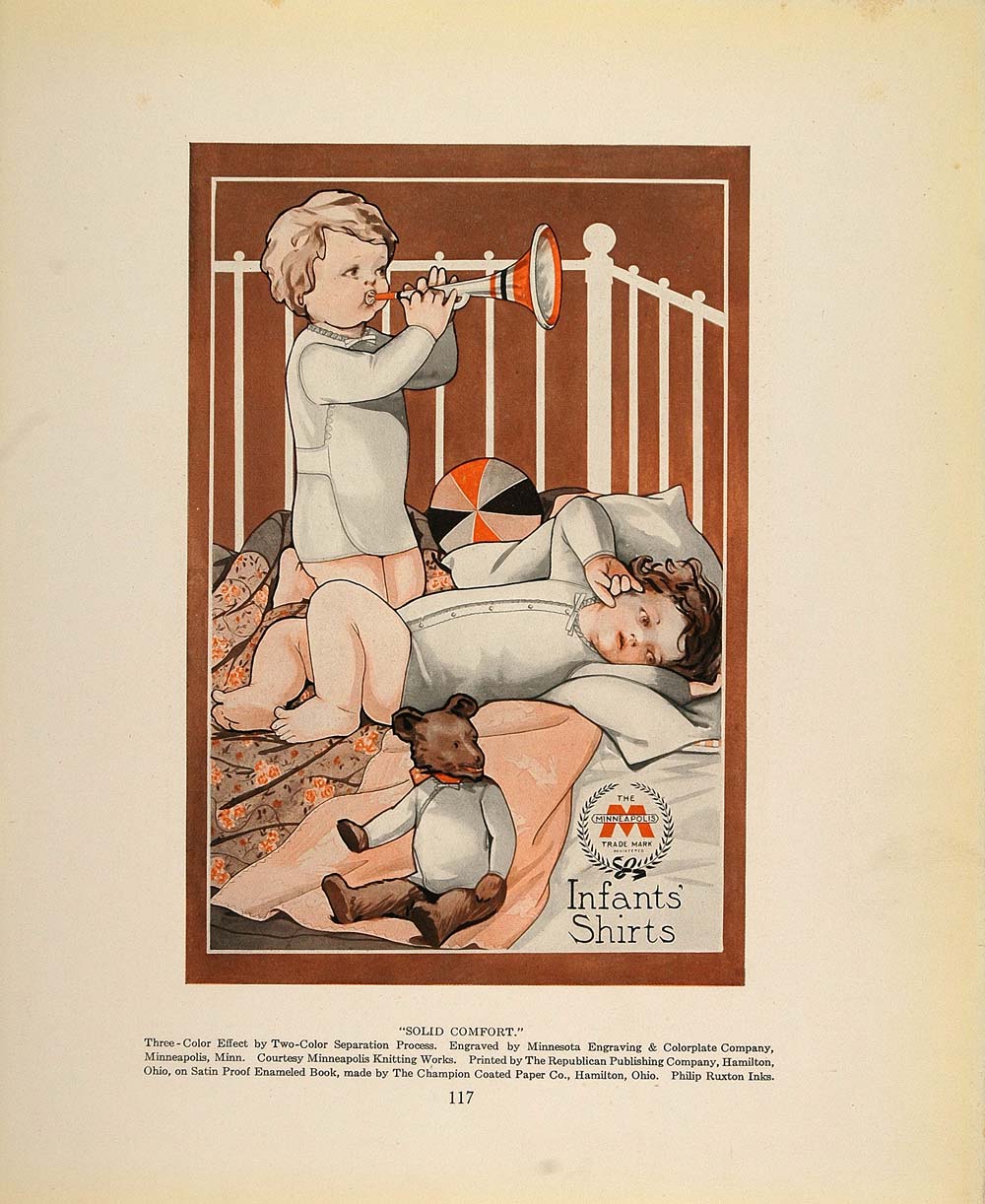 This is an original 1913 color print of an advertising illustration for infant shirts, courtesy of the Minneapolis Knitting Works. Three-color effect by two-color separation process. Engraved by the Minnesota Engraving & Colorplate Company, Minneapolis. Printed by The Republican Publishing Company, Hamilton, Ohio, on Satin Proof Enameled Book made by The Champion Coated Paper Co. Philip Ruxton inks. (Please note that there is printing on the reverse.)