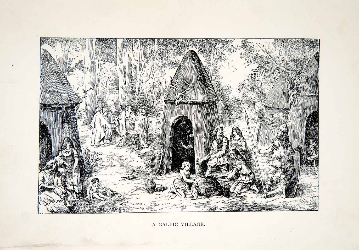 This is an original 1913 black and white wood engraving of a typical Gallic Village during the Middle Ages.