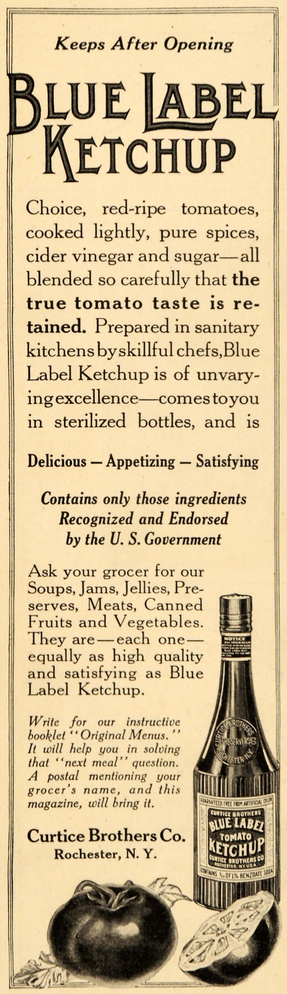 This is an original 1914 black and white print ad for Blue Label Tomato Ketchup by Curtice Brothers Company located in Rochester, New York.