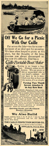 This is an original 1914 black and white print ad for The Caille Perfection Motor Co., maker of the Caille Portable Boat Motor.