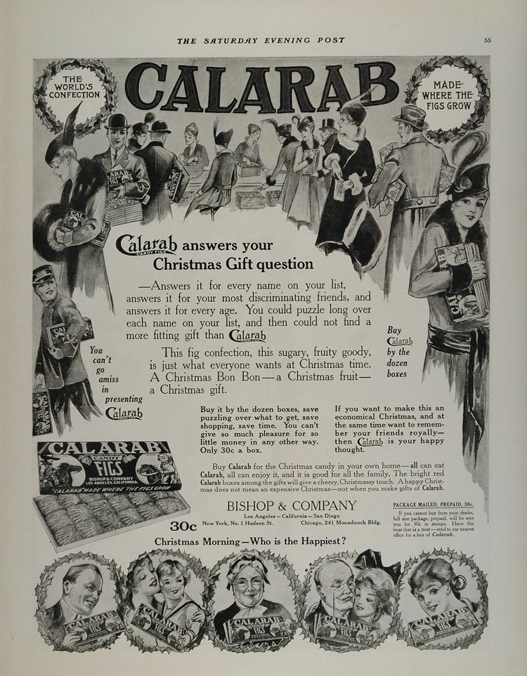 This is an original 1914 black and white print ad for Calarab Candy Figs from Bishop & Co.--the Answer to your Christmas Gift question!