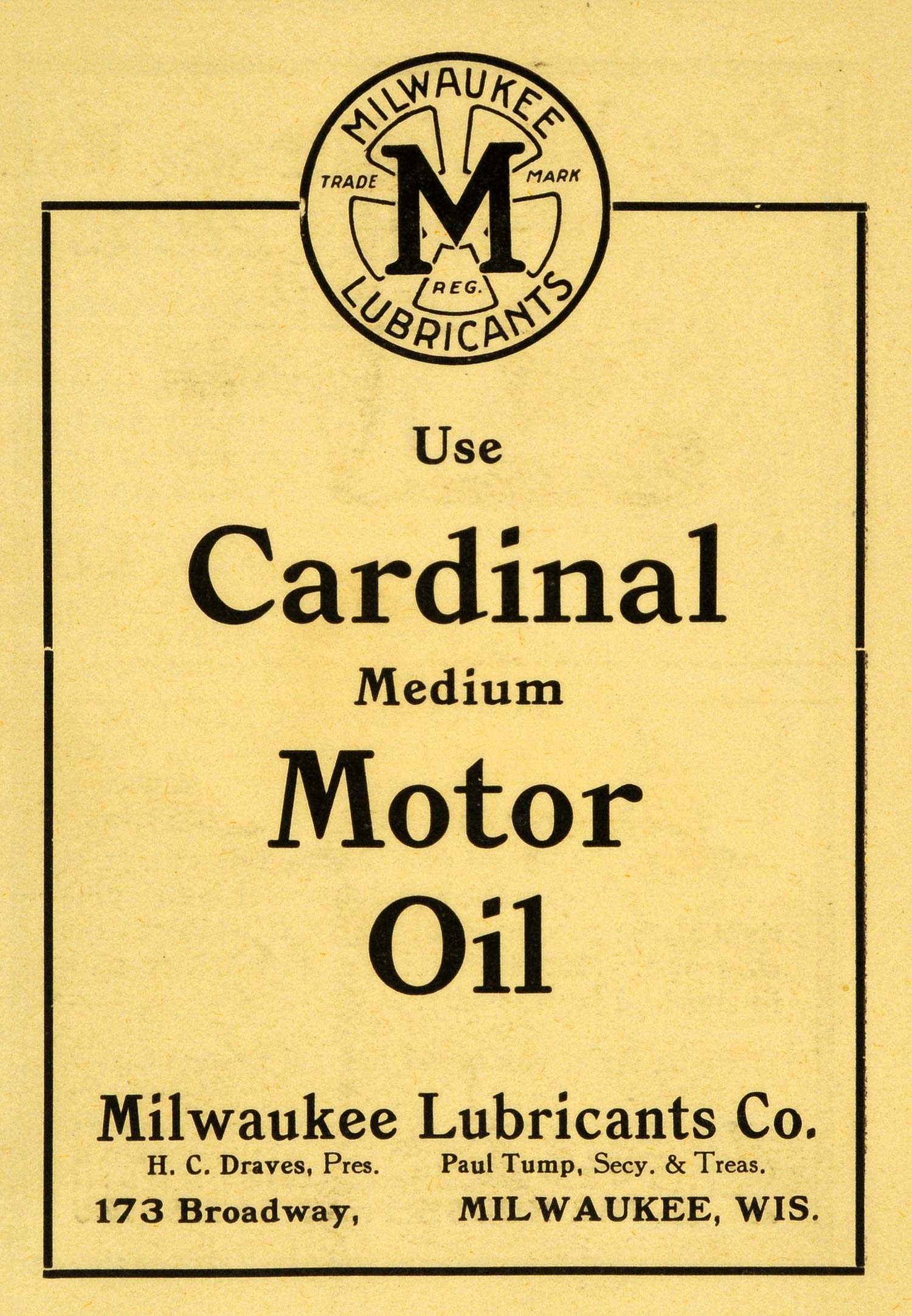 This is an original 1914 black and white print ad for Cardinal Medium Motor Oil by Milwaukee Lubricants Company, located at 173 Broadway, Milwaukee, Wisconsin. H. C. Draves is president and Paul Tump is secretary and treasurer.