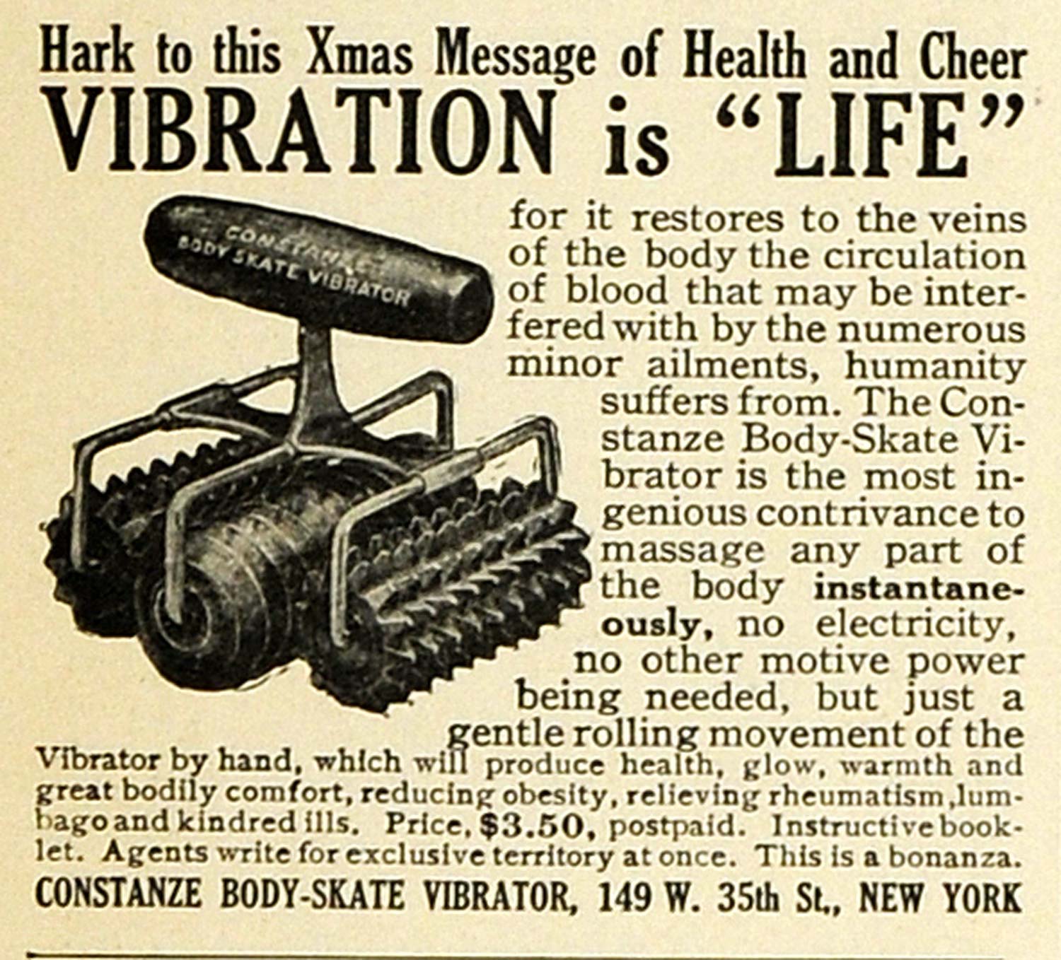 This is a small original 1914 black and white print ad for the Constanze Body-Skate Vibrator to relieve rheumatism from Constanze Body-Skate Vibrator located at 149 W. 35th Street, New York City.