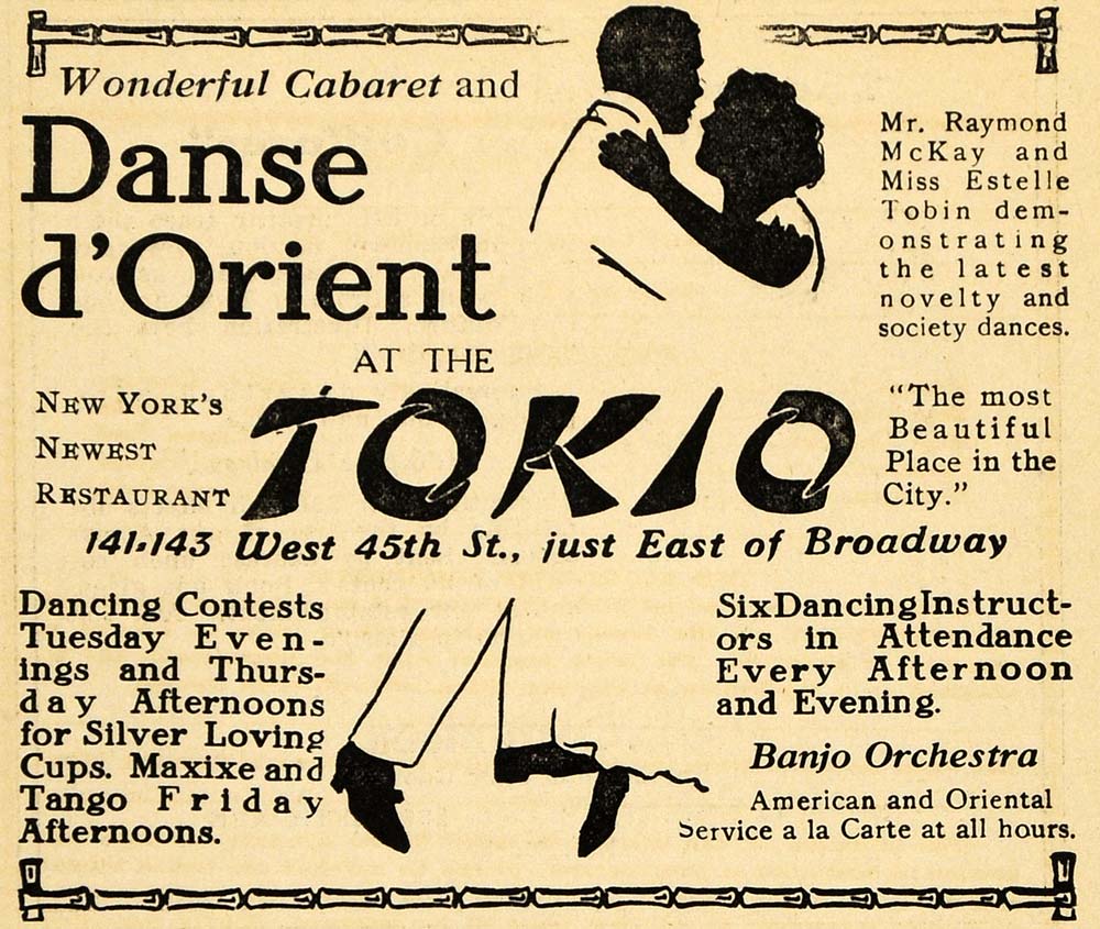 This is an original 1914 black and white print ad for the Danse d'Orient at the Tokio restaurant in Broadway. The ad writes, "Mr. Raymond McKay and Miss Estelle Tobin demonstrating the latest novelty and society dances."