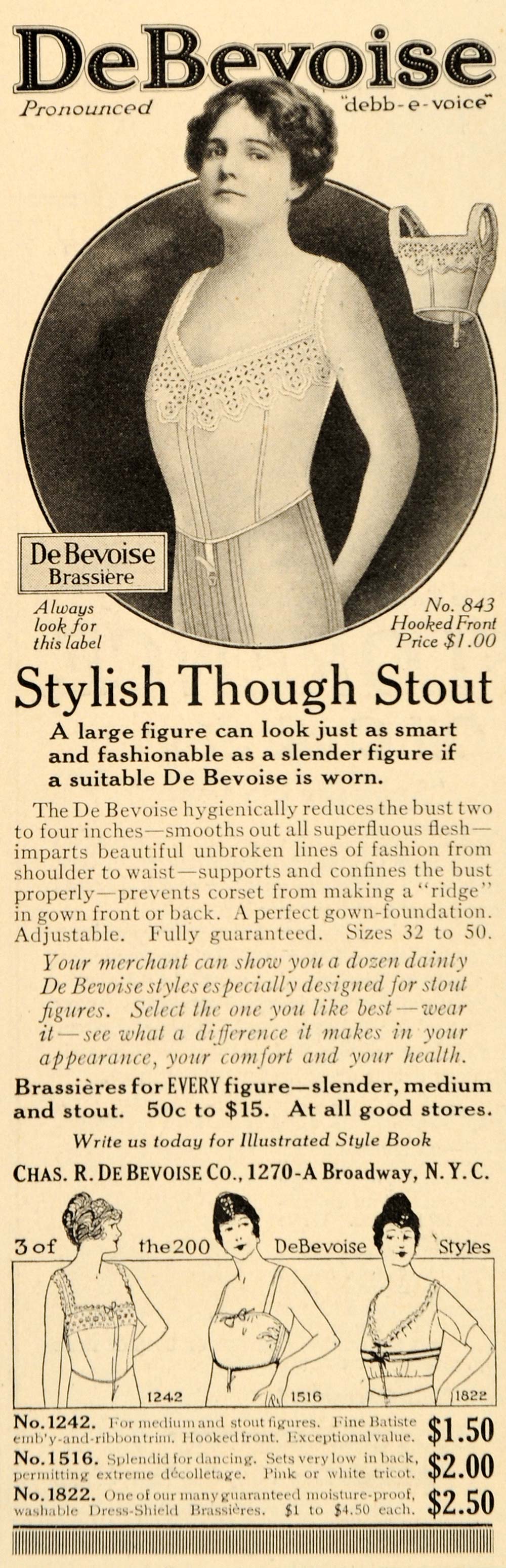 This is an original 1914 black and white print ad for DeBevoise Brassiere owned by Chas. R. DeBevoise Company located on 1270-A Broadway, New York City. This ad shows the new model brassieres for every figure- slender, medium and stout (No. 1242, 1516, 1822, 843).