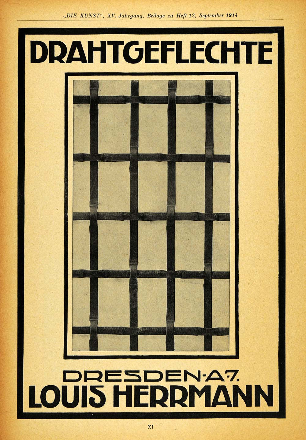 This is an original 1914 black and white print ad for Drahtgeflechte, or wire mesh, from Louis Herrmann. Please note that there is printing on the reverse.