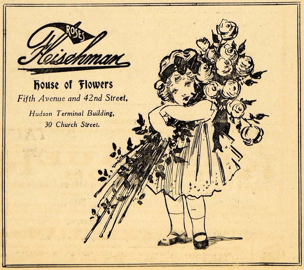 This is an original 1914 black and white print ad for Fleischman florists. The ad features an image of a little girl holding a bunch of roses.