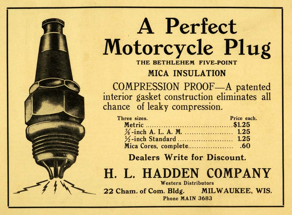 This is an original 1914 black and white print ad for the Bethlehem Five-Point Mica Insulation, perfect motorcycle plug with Mica Insulation. This compression proof part is by H. L. Hadden Company, they are located at 22 Chamber of Commerce Building, Milwaukee, Wisconsin.