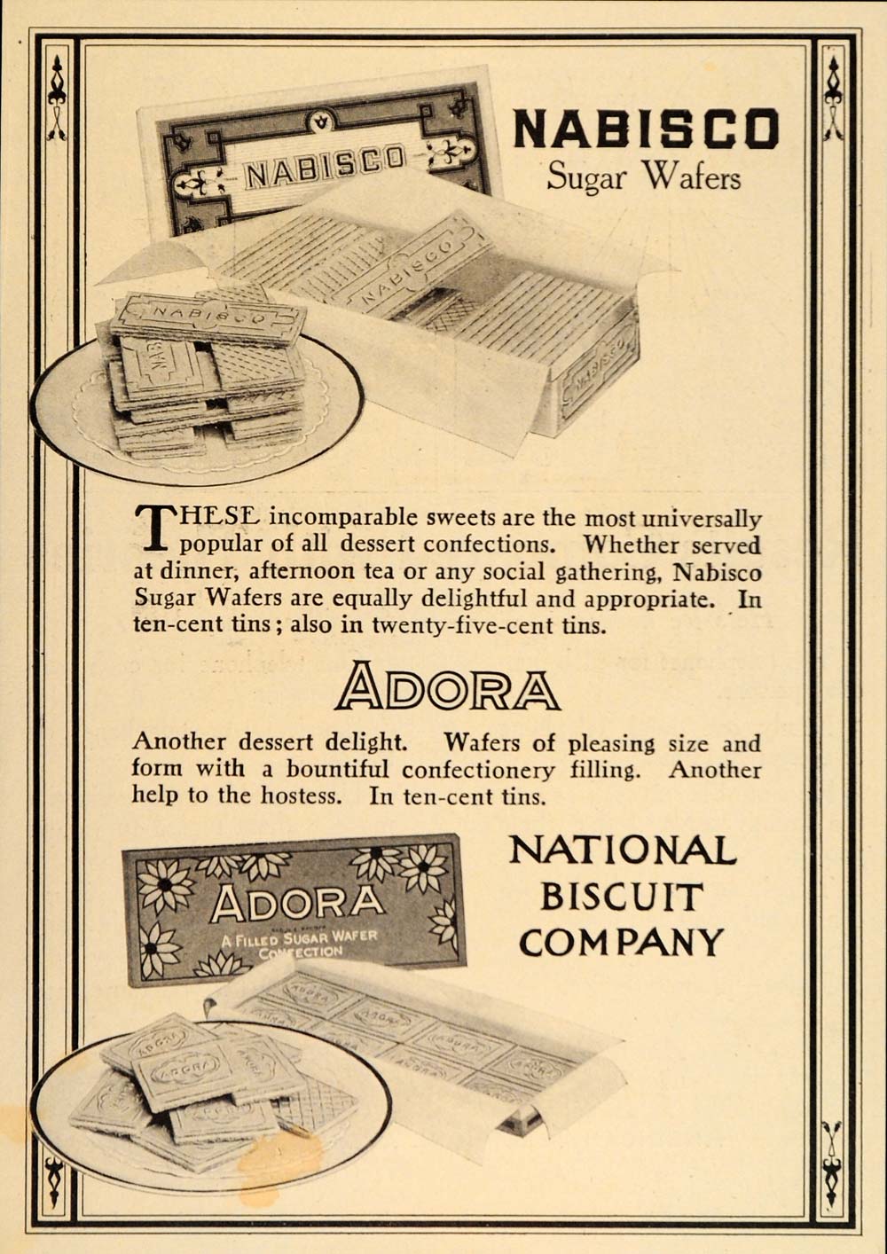 This is an original 1914 black and white print ad for Nabisco Sugar Wafers and Adora, a filled sugar wafer confection, from the National Biscuit Company.