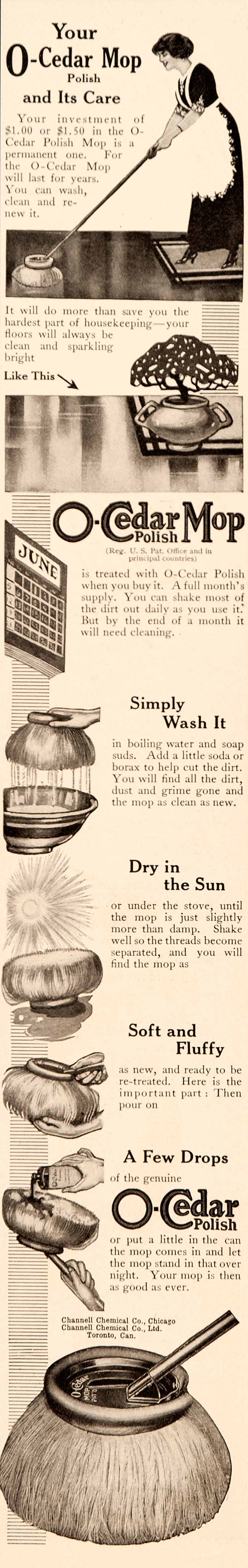 This is an original 1914 black and white print ad for O-Cedar Mop Polish from the Channell Chemical Co. located in Chicago, Illinois.