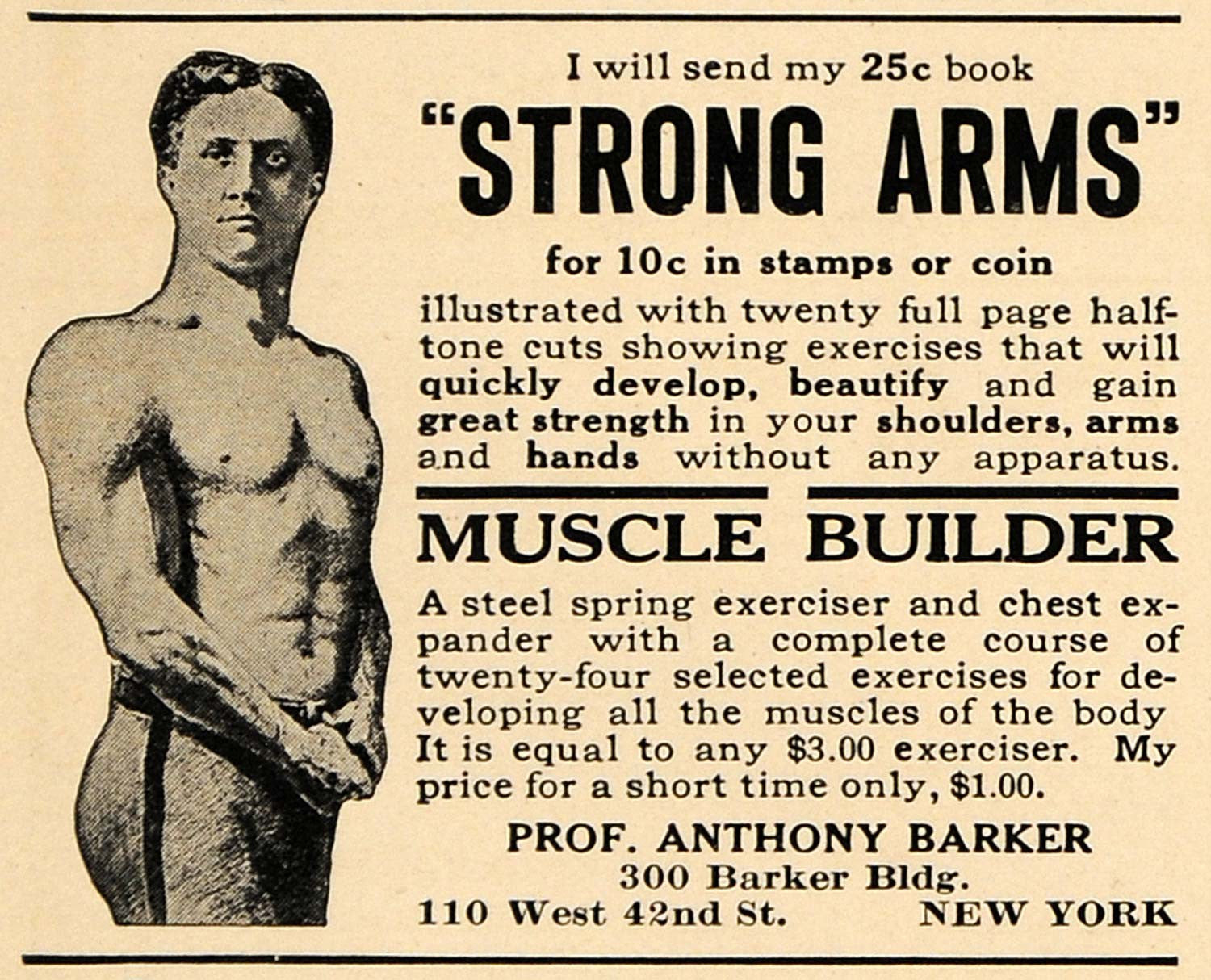 This is an original 1914 black and white print ad for Professor Anthony Barker, whose teachings will teach you to be a muscle builder. Prof. Barker is located at 300 Barker Building at 110 West 42nd Street in New York. His book is entitled "Strong Arms".