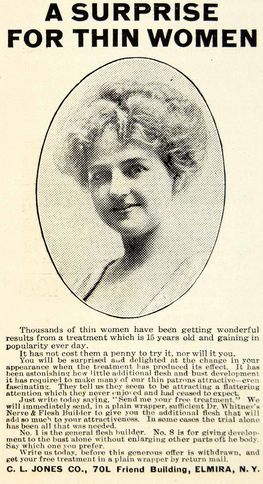 This is an original 1914 black and white print ad for Dr. Whitney's Nerve & Flesh Builder, a treatment to help thin women gain weight. Available from C. L. Jones, 70L Friend Building, Elmira, NY.