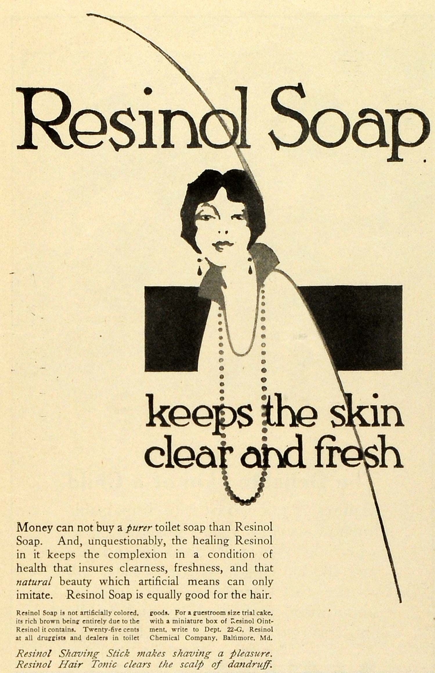 This is an original 1914 black and white print ad for the Resinol Chemical Company of Baltimore, Maryland; this ad features their Resinol Soap for cleansing the skin.