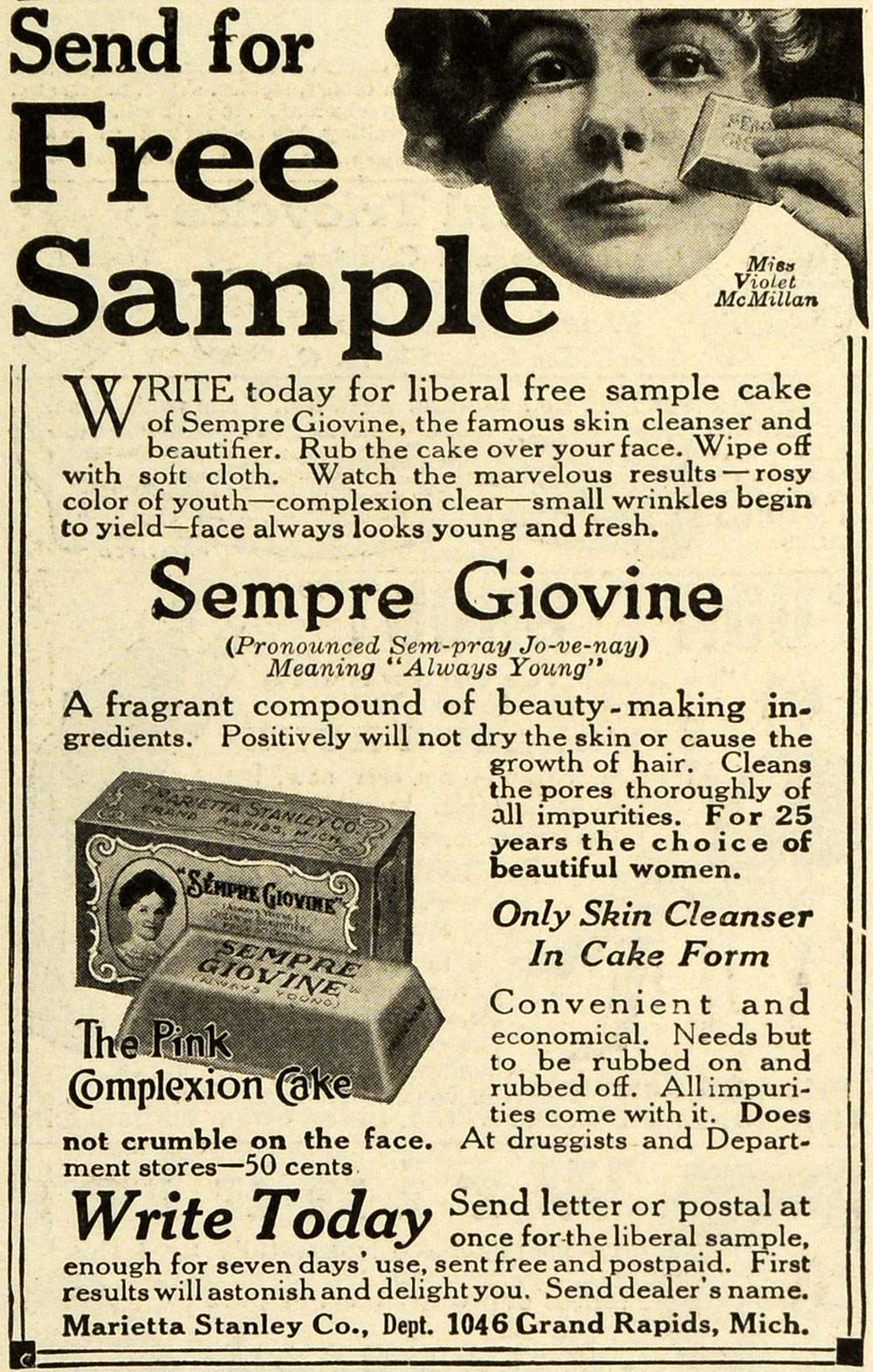 This is a small original 1914 black and white print ad for Sempre Giovine, the Pink Complexion Cake, a product by the Marietta Stanley Company, located at 1046 Grand Rapids, Michigan. This particular ad features Miss Violet McMillan.