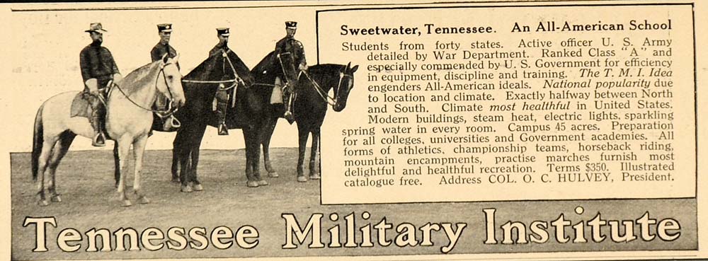 This is an original 1914 black and white print ad for the Tennessee Military Institute for boys in Sweetwater, Tennessee. Colonel O. C. Hulvey, President.