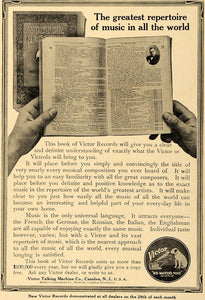 This is an original 1914 black and white print ad for the Victor Talking Machine Company of Camden, New Jersey, featuring their Victrola record player and their Victor Record label. They offer a booklet with lists of all the musical listening opportunities that Victor has.
