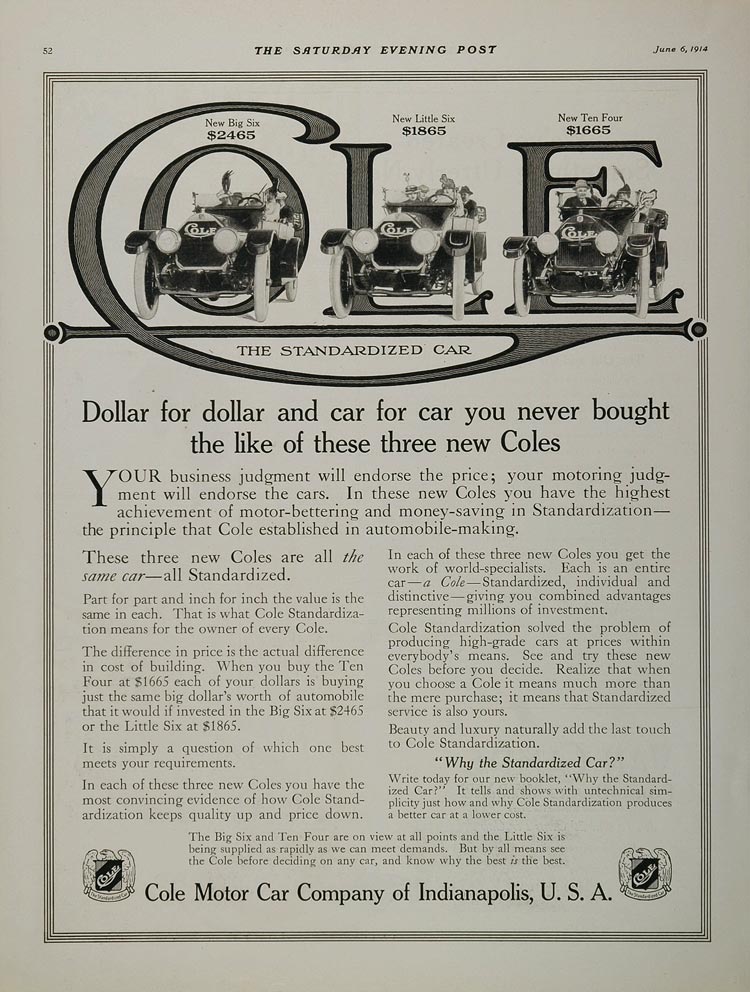 This is an original 1914 black and white print advertisement for Cole automobiles from the Cole Motor Car Company of Indianapolis, IN. Illustrated here are: the Cole New Big Six ($2465); the Cole New Little Six ($1865); and the Cole New Ten Four ($1665).