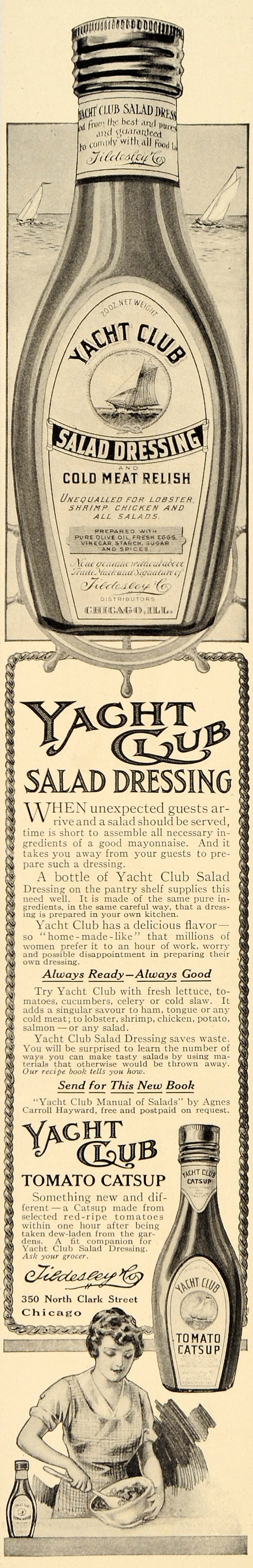 This is an original 1914 black and white print ad for Yacht Club Salad Dressing made by the Tildesley Company located at 350 North Clark Street, Chicago, IL. The ad also features Yacht Club Tomato Catsup
