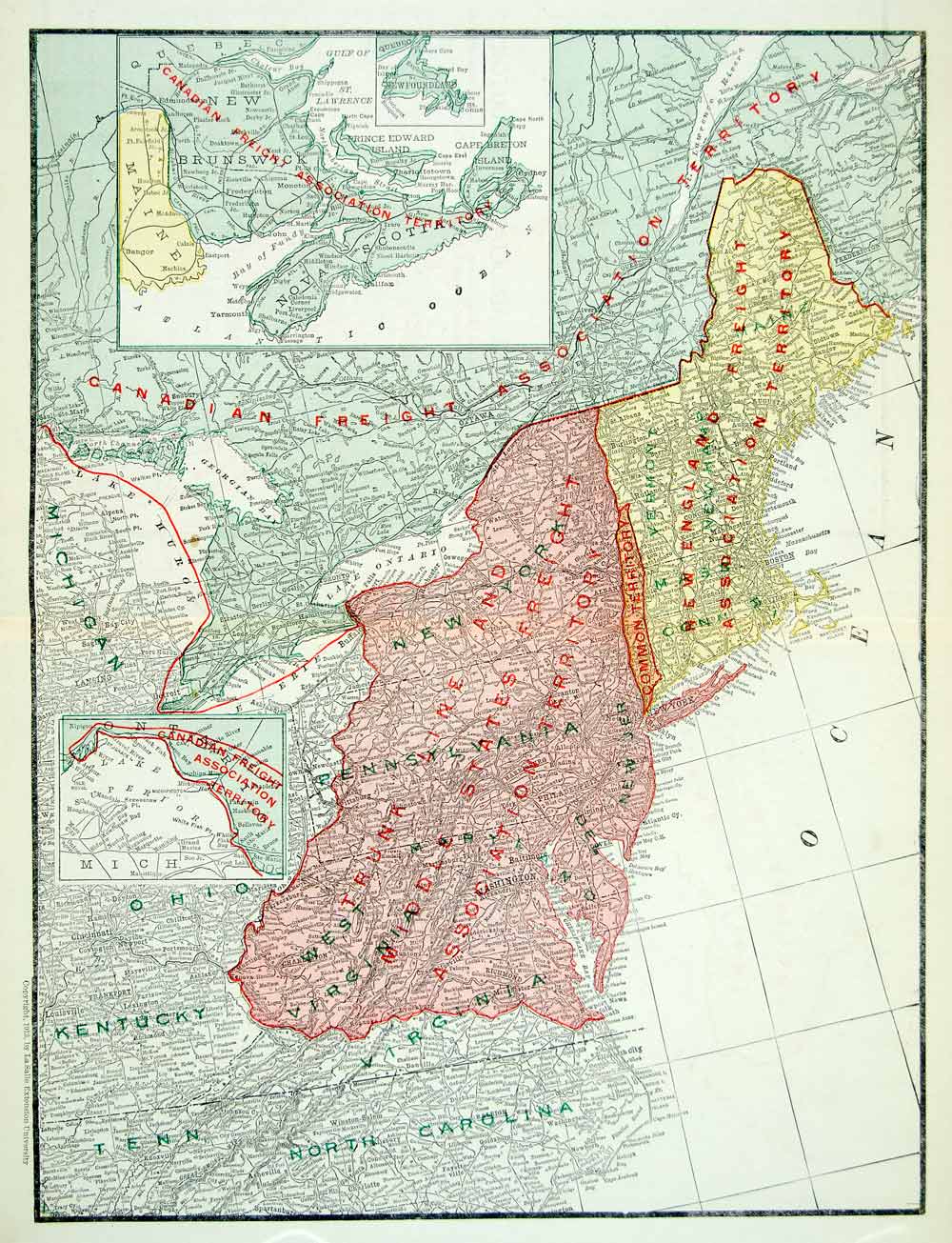 This is an original 1914 color wax engraving of a map showing the Freight Association Territories in the northeast USA and Canada: the Canadian Freight Association Territory; New England Freight Association Territory; Trunk Line Association Territory; and the Common Territory. Copyright © 1913 by La Salle Extension University.