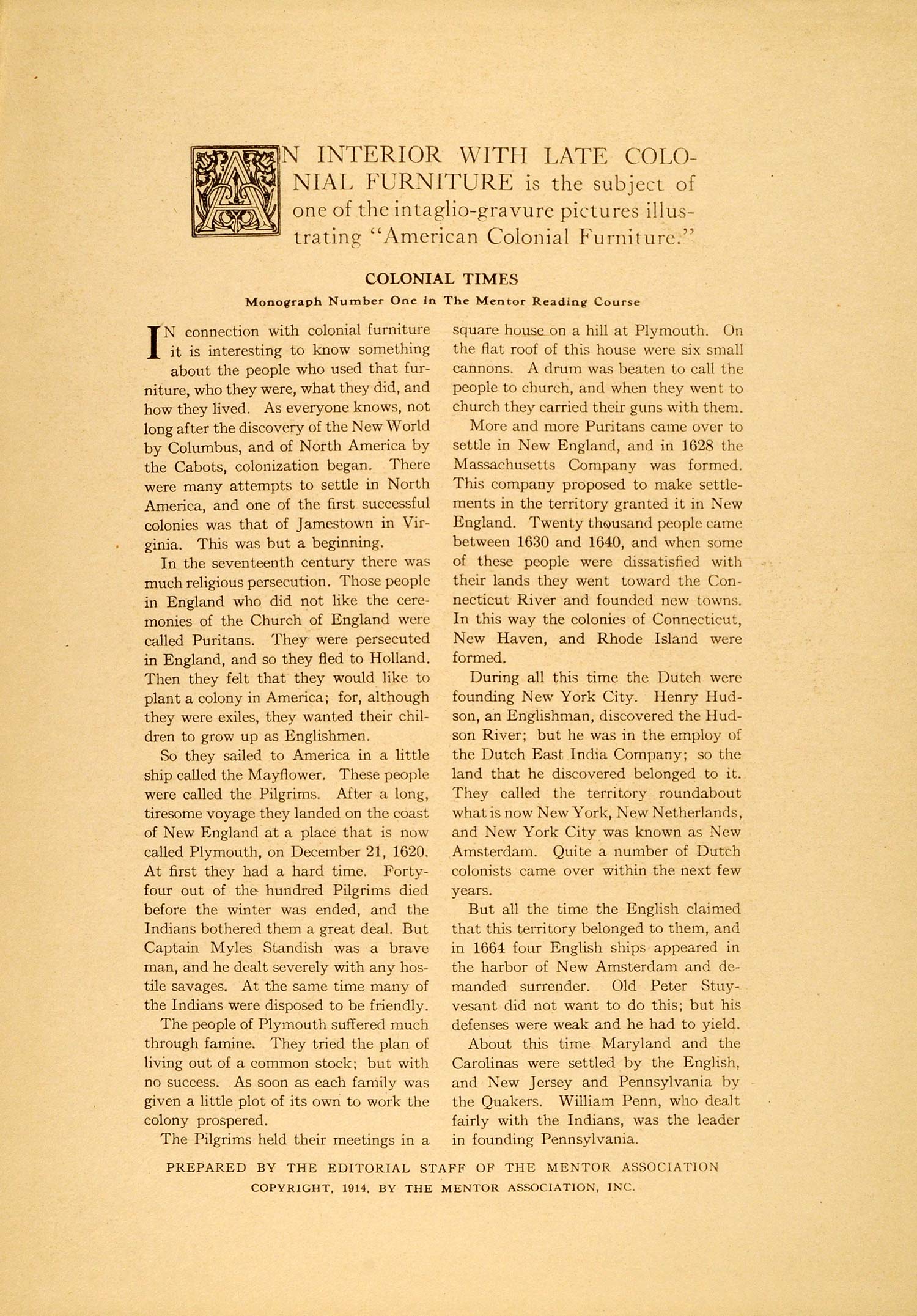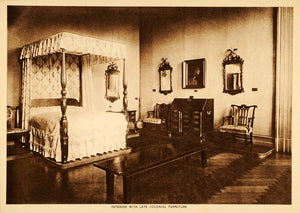 This is an original 1914 intaglio print of a late American Colonial bedroom with four-poster bed, desk, chairs and mirrors. On the reverse is a short article about Colonial life in America. Please see both images.