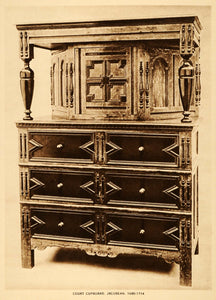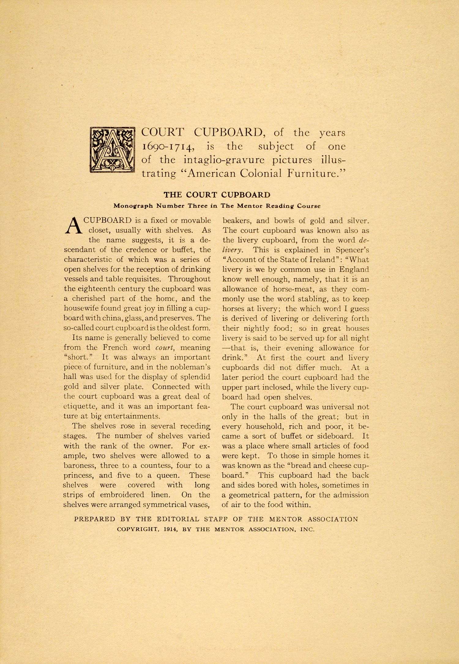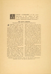 This is an original 1914 intaglio print of a Jacobean court cupboard. On the reverse is a short article about court cupboards. Please see both images.
