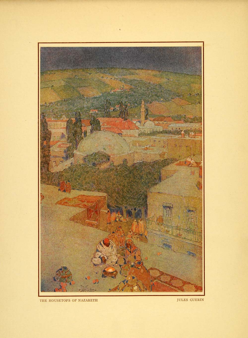 This is an original 1914 tipped-in color print of a watercolor drawing by Jules Guerin of the rooftops of Nazareth.