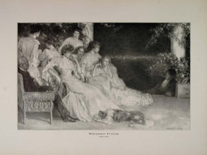 This is an original 1914 halftone print of a painting by Louis Loeb. A lovely portrait of a languid midsummer evening's gathering of Victorian women, men, and a dog. One can almost feel the warm sultry night air.