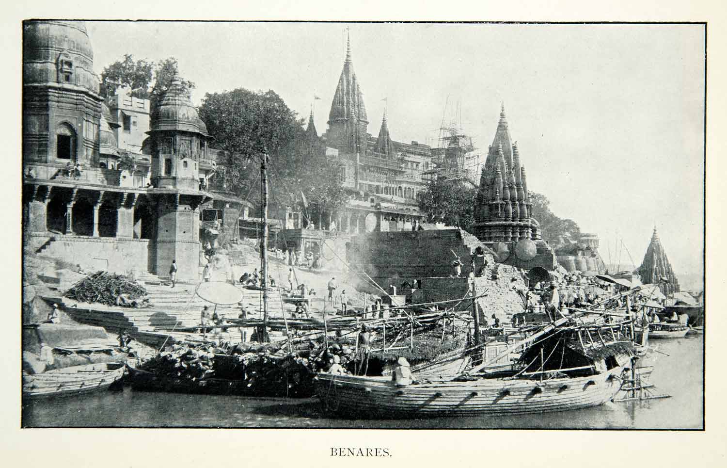 This is an original 1914 black and white halftone print of boats docked on the banks of the river Ganges in Benares (Varanasi) in Uttar Pradesh, India. It is one of the oldest continuously-inhabited city in the world, and the oldest in India; additionally, it's considered to be the holiest city of the seven Sapta Puri (sacred cities in Hinduism and Jainism).