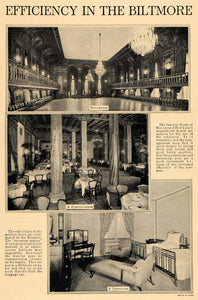 This is an original 1914 halftone print of the interior of the New York Biltmore Hotel showing the ballroom, a dining room and a bedroom. The Biltmore was a hotel in New York City -- one of three luxury hotels built as part of the Terminal City development in New York City. It operated from 1913-1981 and the structure, now known as 335 Madison Ave., is currently occupied by the Bank of America.