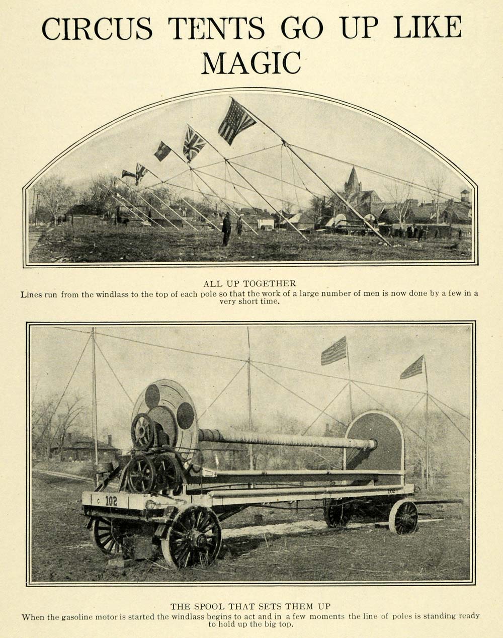 This is an original 1914 halftone print of the gasoline motor that, when started, initiates the windlass, which begins to construct the poles used for the big top and other circus tents.