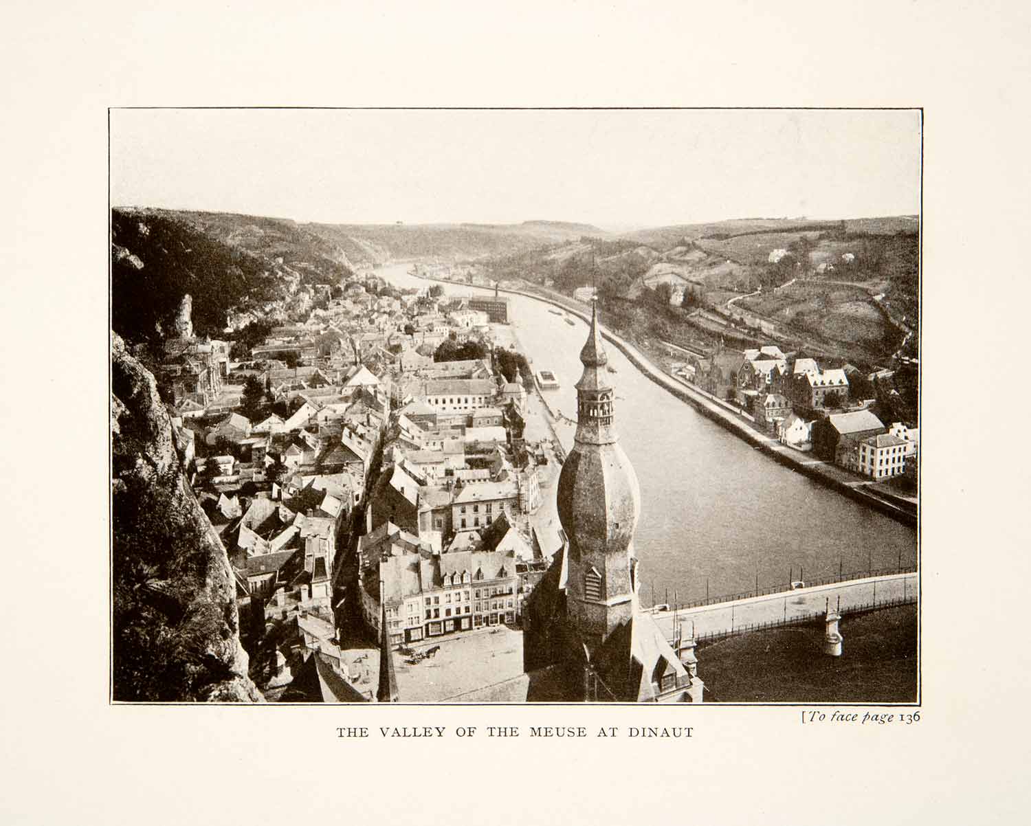 This is an original 1914 black and white halftone print of "The Valley of the Meuse at Dinaut." This early twentieth century image captures the Walloon city of Dinant in the Belgian province of Namur, Belgium. The image was captured from the vantage point of the citadel, a fortified structure dating to the eleventh century. In the foreground is seen the famous onion dome of the Collegiate Church of Notre-Dame, a Romanesque church that was rebuilt in the Gothic style following its partial destruction from falling rocks from the adjacent cliff.