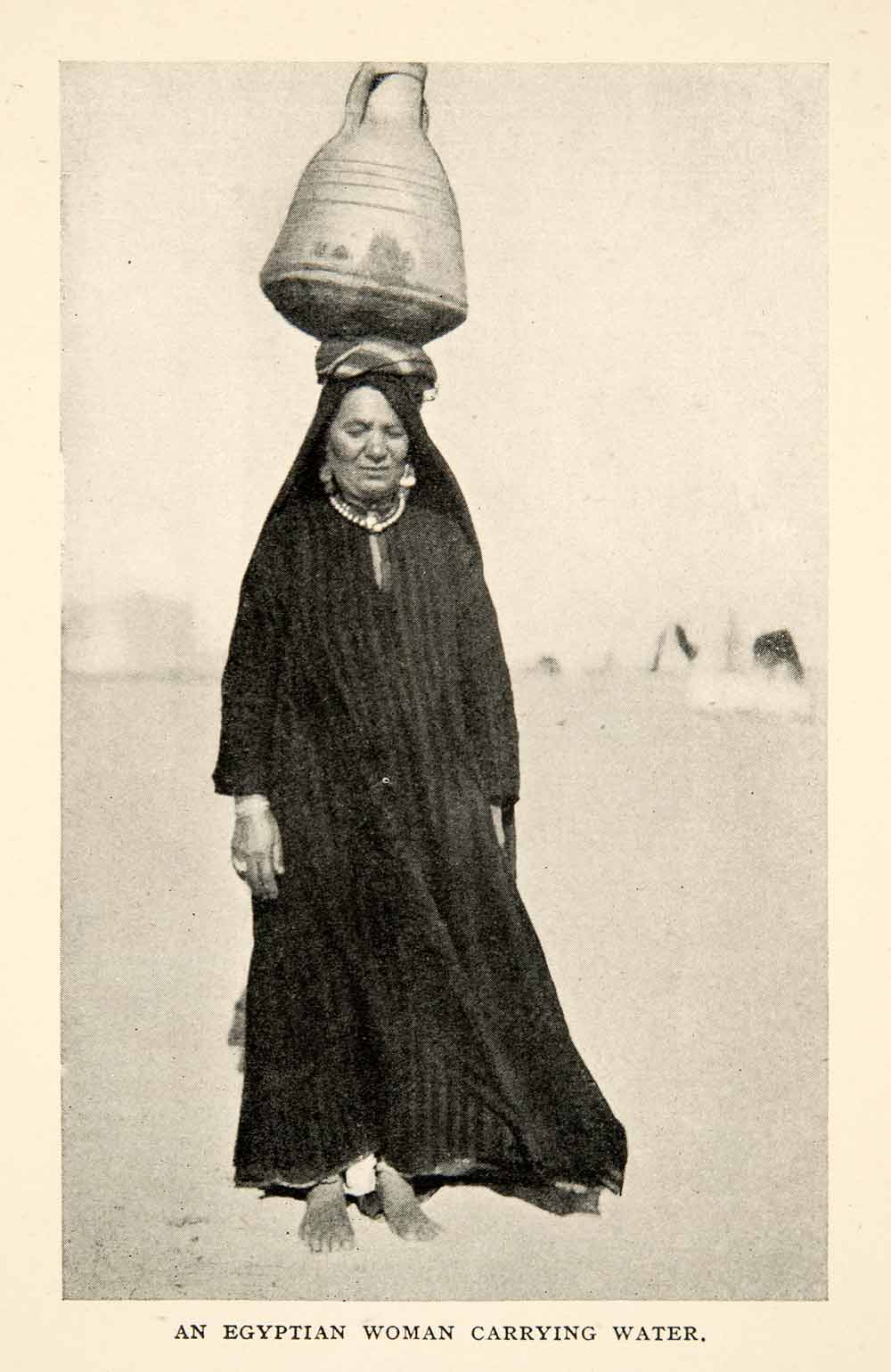 This is an original 1914 black and white halftone print of an Egyptian woman carrying water.