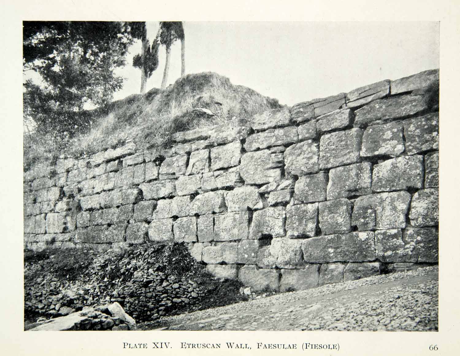 This is an original 1914 black and white halftone print of the ruins of the Etruscan Wall at Fiesole, Italy.