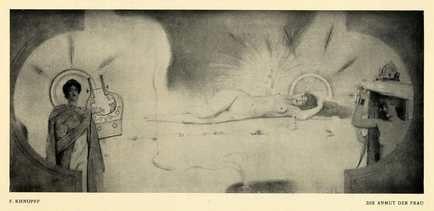 This is an original 1914 halftone print of Die Anmut der Frau by F. Khnopff. Khnopff was a Belgian symbolist painter who was born into a wealthy family who was part of the high bourgeoisie. He worked as a correspondent for the British art journal "The Studio".