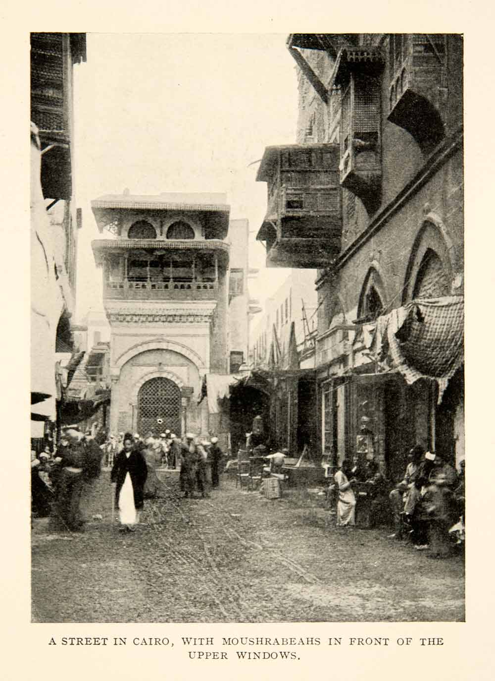 This is an original 1914 black and white halftone print of a street scene in Cairo with Moushrabeahs (mesh gate-like structures) in front of the upper windows to the women's quarters.