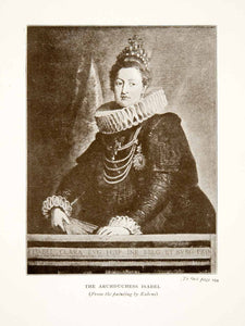 This is an original 1914 black and white halftone print of "The Archduchess Isabel," from the painting by Rubens. This is a portrait of Isabella Clara of Austria, daughter of Leopold V, Archduke of Austria and his wife Claudia de' Medici; member of the House of Habsburg, Archduchess of Austria, and Duchess of Mantua and Monferrato as wife of Charles III, Duke of Mantua and Monferrato. The marriage was an important strategic alliance between the Gonzaga and Habsburg families. Isabella's husband Charles III died suddenly in 1665 and she assumed the regency on behalf of her son, Charles IV. In 1671, by order of the Emperor, she entered a convent where she remained throughout the rest of her life, dying in 1685.