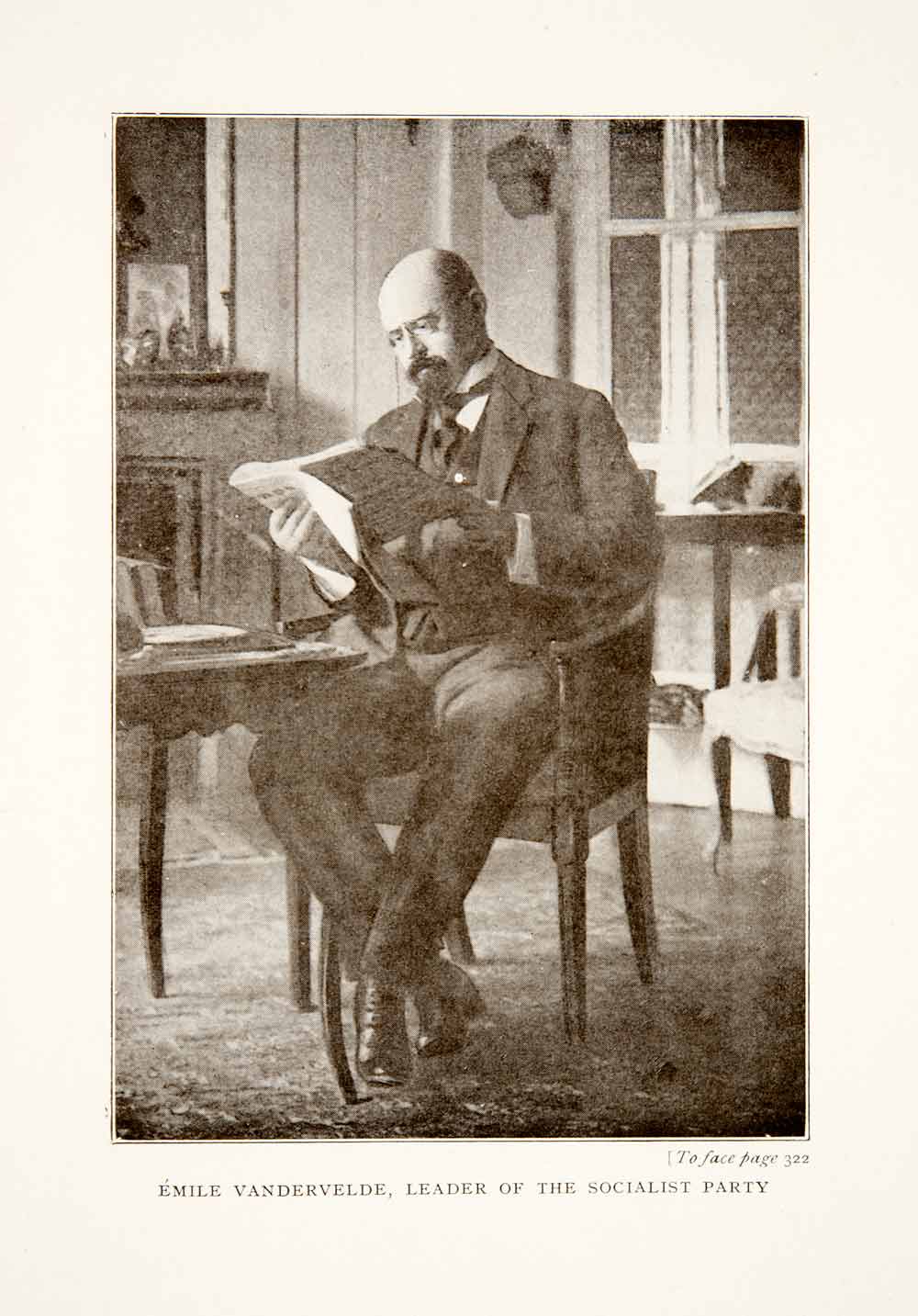 This is an original 1914 black and white halftone print of "Émile Vandervelde, Leader of the Socialist Party." Emile Vandervelde became a member of the Belgian Labour Party (Belgische Wekliedenpartij or Parti Ouvrier Belge), the first socialist labor party of Belgium, in 1886. He later acted as president of the party from 1928 to 1938.