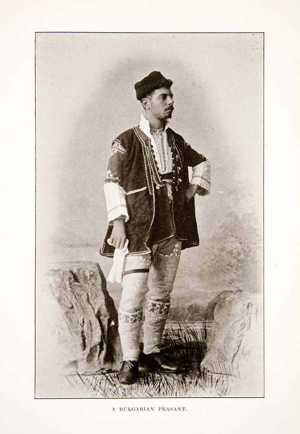This is an original 1914 black and white halftone print portrait of a Bulgarian peasant in his traditional clothing.