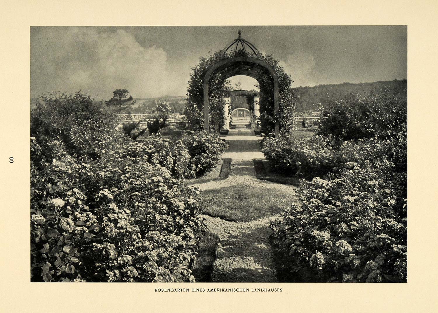This is an original 1914 halftone print of Rosengarten Eines Amerikanischen Landhauses which translates to Rose Garden One American Country House. This beautiful rose garden has walking paths and arches that create interesting breaks of light and shade.