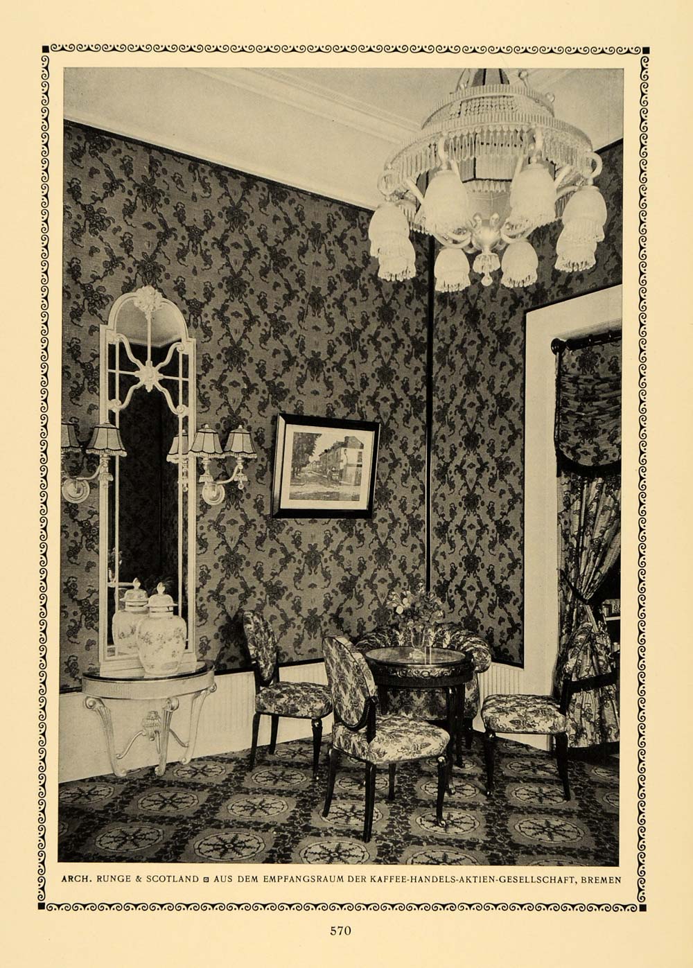 This is an original 1914 halftone print of the reception hall of the Kaffee-Handels-Aktien-Gesellschaft in Bremen, Germany (Deutschland). The architects of the building were Runge and Scotland.