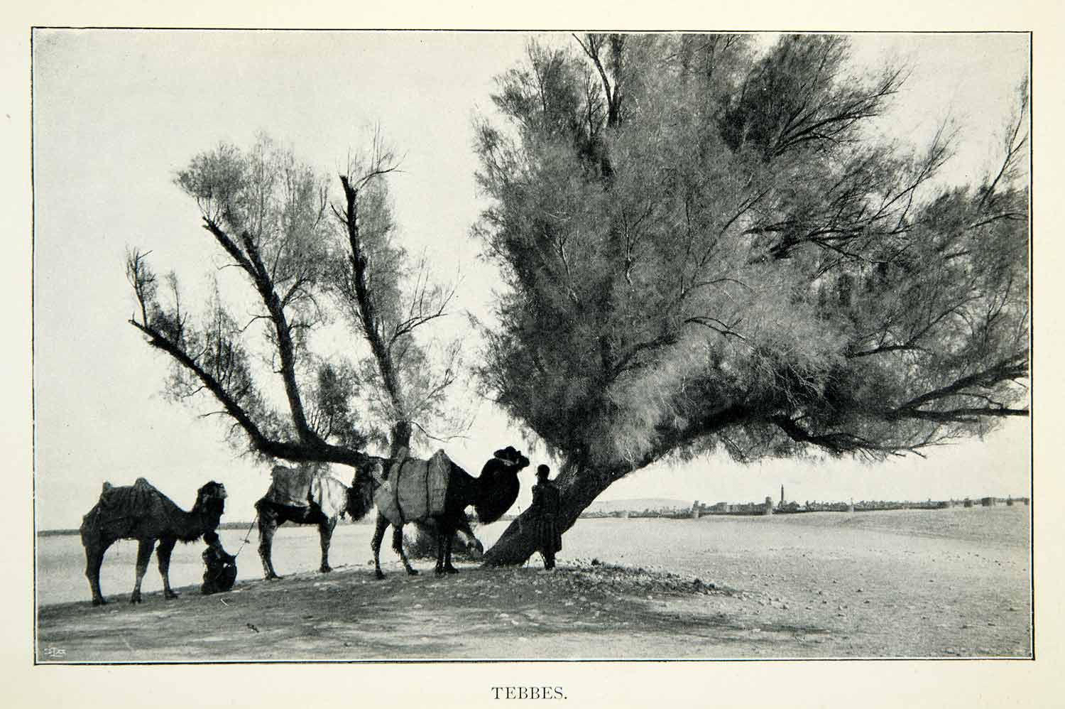 This is an original 1914 black and white halftone print of Tebbes, possibly referring to Tabas or a similar location in Iran. The large tree is a tamarisk.