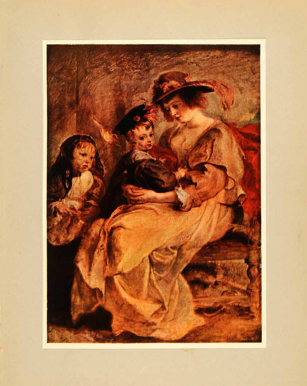 This is an original 1914 tipped-in color print of a portrait of Hélène Fourment, the artist's second wife and two children.
