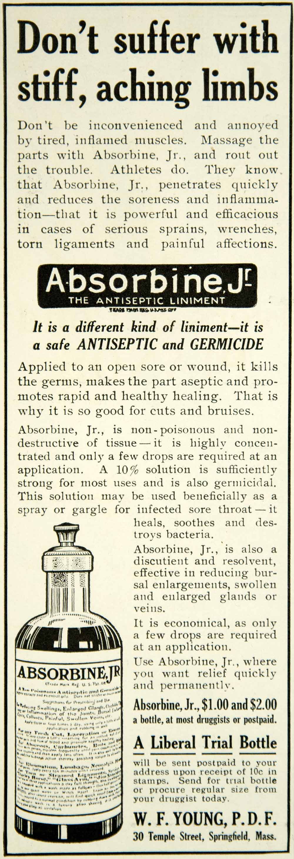 This is an original 1915 black and white print ad for Absorbine Jr., an antiseptic liniment from W. F. Young, who was located at 30 Temple Street in Springfield, Massachusetts.