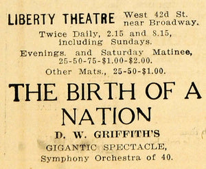 This is a small original 1915 black and white print ad for "The Birth of a Nation" at the Liberty Theatre.