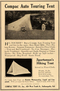 This is an original 1915 black and white print ad for a Compac Auto Touring Tent and a Sportsman's Hiking Tent from the Compac Tent Co., Inc., 420 West Tenth St., Indianapolis, IN.