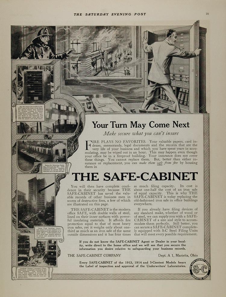 This is an original 1915 black and white print ad for The Safe-Cabinet from The Safe-Cabinet Company, Marietta, Ohio with illustrations of various companies whose important documents were saved from fire by the Safe-Cabinet including: the Western Cabinet & Fixture Company plant in Kansas City; the Zanesville Municipal Building; the Union Trust Building, Cincinnati; and the Goodyear Rubber Company plant in Milwaukee.