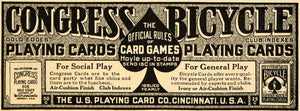 This is an original 1915 black and white print ad for Congress Playing Cards and Bicycle Playing Cards by The U. S. Playing Card Company located in Cincinnati, Ohio.