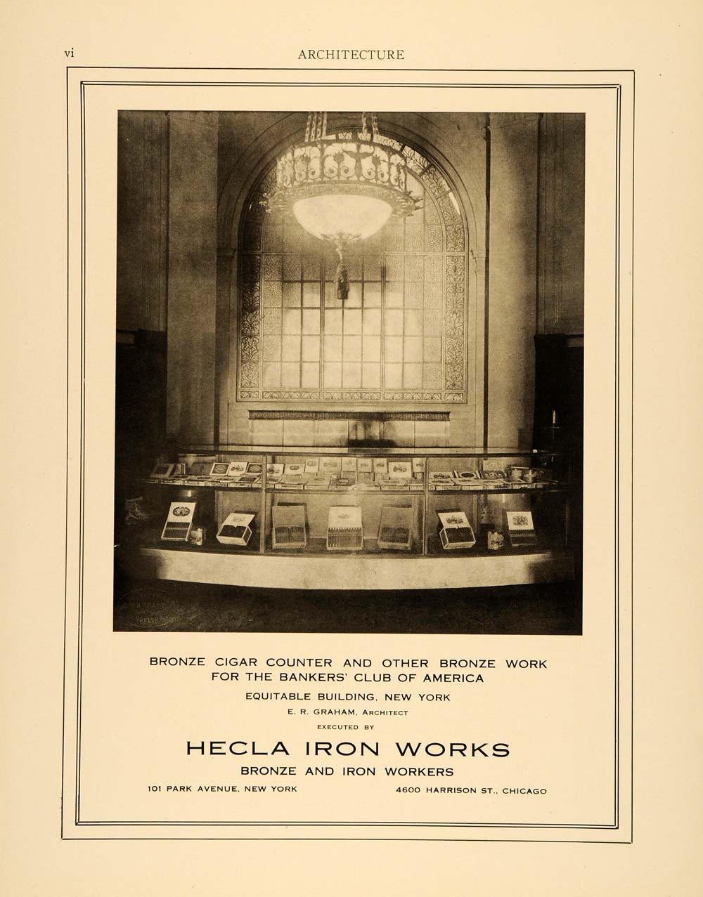 Pictured in the image is the Bronze Cigar Counter and other Bronze Work for the Bankers' Club of America located on the Equitable Building in New York. Architect: E. R. Graham.